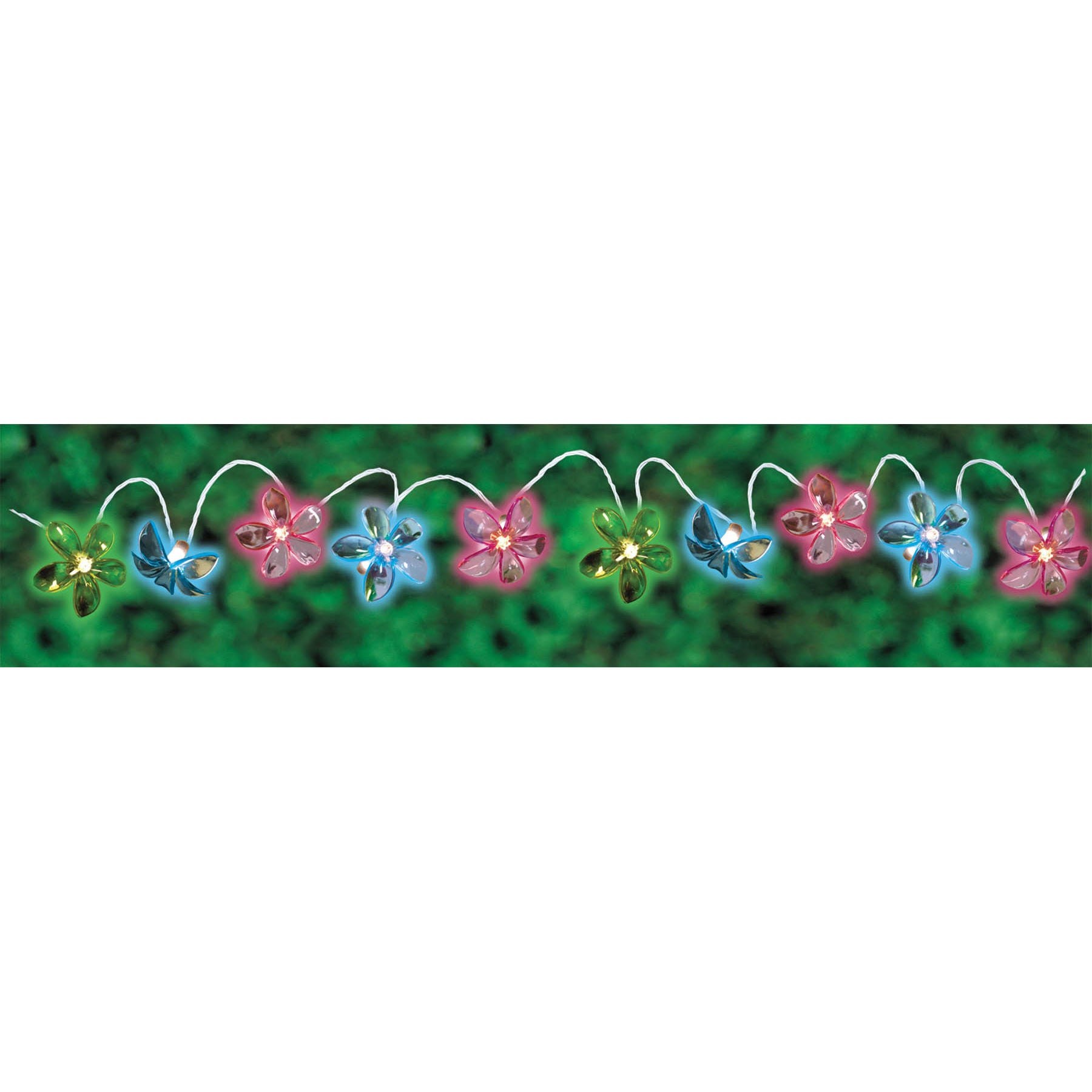 These Flower Lights feature a string of steady burning lights with green, blue, and hot pink plastic floral covers. Lights measure 8 1/2' in total length with 6' of lighted length.