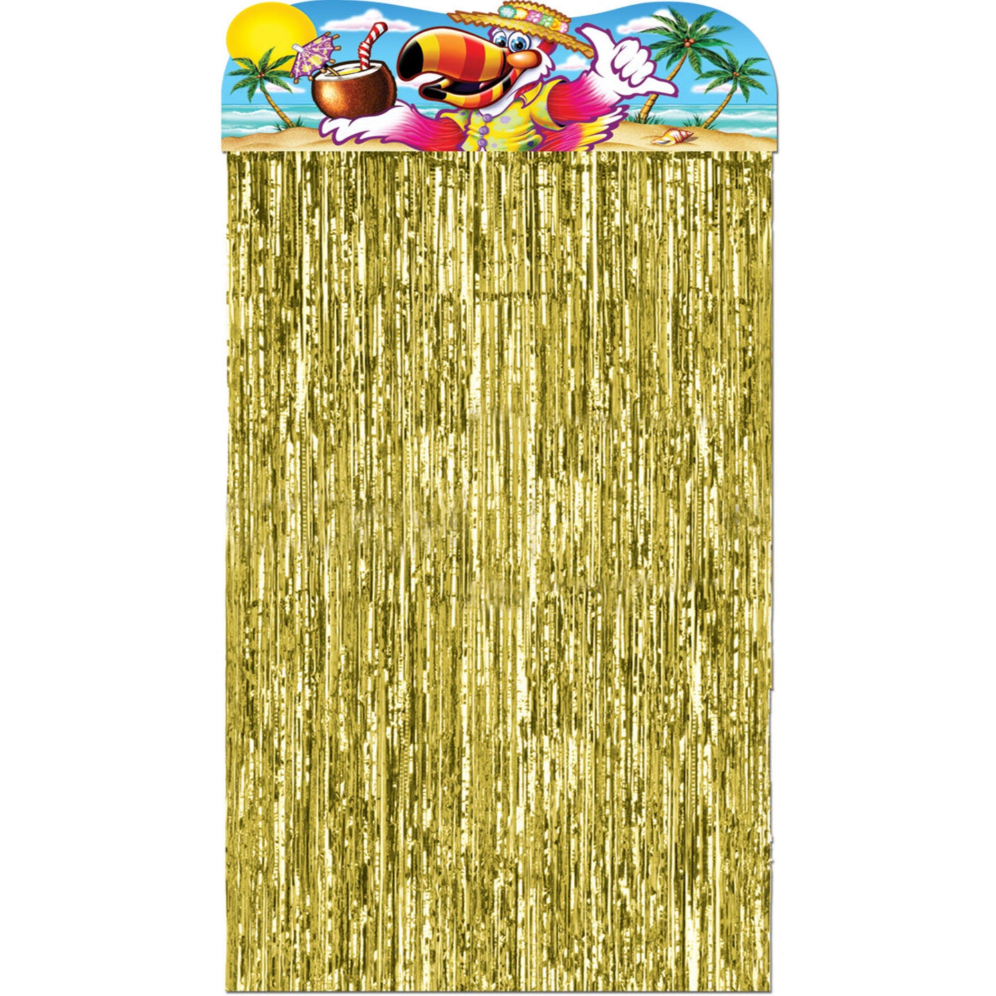 Add some sparkle to your luau party with this metallic Luau Character Curtain. Hang from a doorway to create a look and feel that's truly tropical. Gold metallic curtain with toucan cutout. Printed on both sides. Measures 4.5' x 3'.